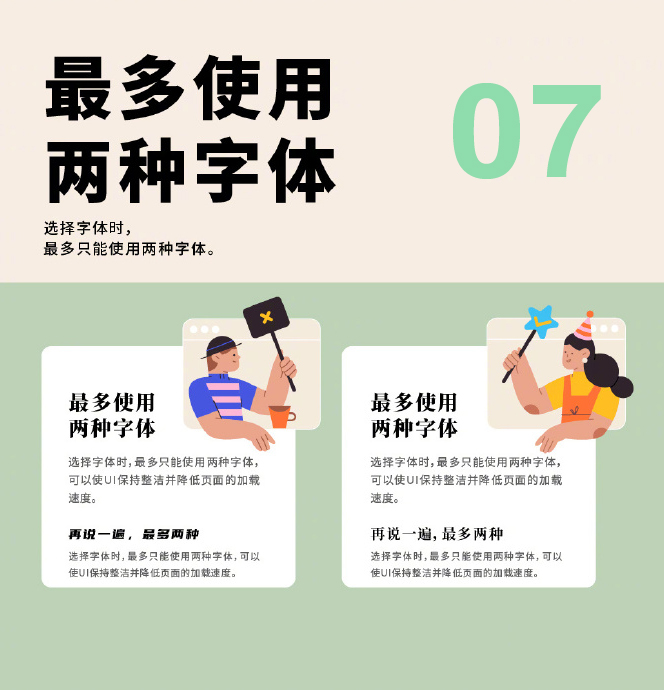 選擇字體時,最多只能使用兩種字體,可以使UI保持整潔并降低頁面的加載連度。